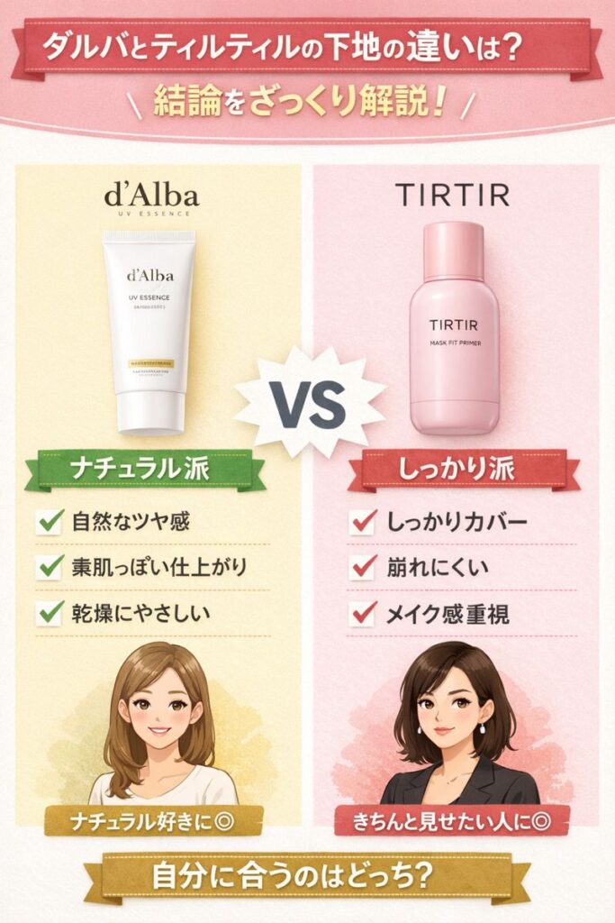 この記事では、ダルバとティルティルの下地を仕上がり・肌質・使い方の視点から比較していきます。